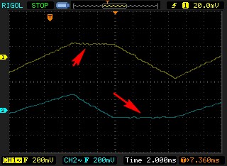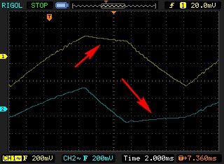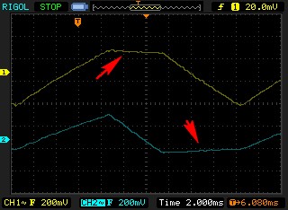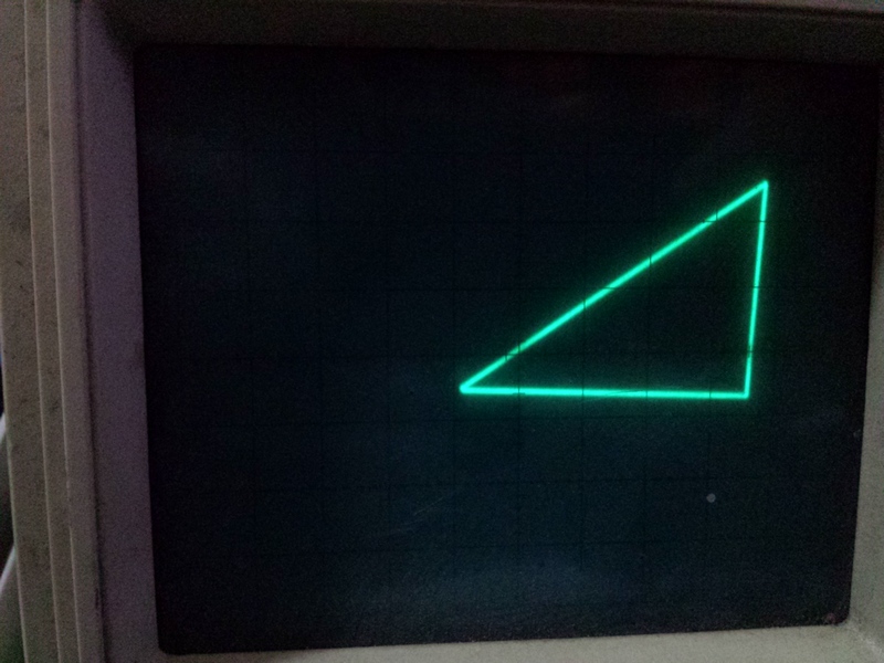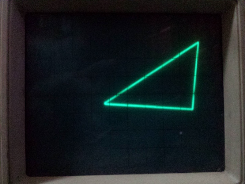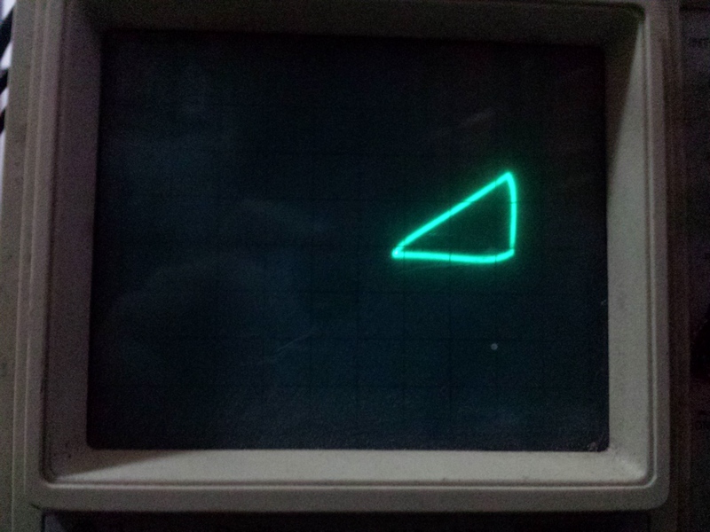Here you can see the distortion on the two analyzed areas. In fact, this board doesn't have a good step-response (Despite this waveform having no step signal, I could check this with another waveform later, and got too much overshooting). That prevented the scope trace from being stable on either axis X or Y during drawing, then rendering the following distorted triangle: